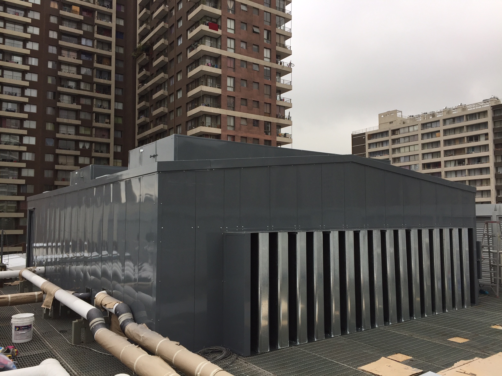 Los equipos de climatización de este proyecto se encuentran en el techo del edificio Data Center, rodeado de edificios residenciales. Silentium diseñó, construyó e instaló el encierro acústico para los chiller, que, además del desafío de reducción de ruido, presentaba un desafío importante para permitir un adecuado flujo de aire para su funcionamiento.